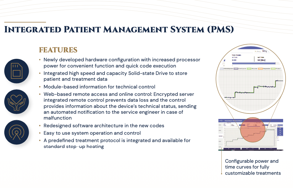 - Nagy, felhasználóbarát érintőképernyős kijelző a rendszer teljes vezérlésével, amely valós időben jeleníti meg a teljesítményt, az impedanciát, a hőmérsékletet és a kezelés időtartamát.